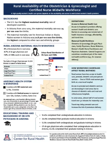A high-quality maternal health care system relies in part on the right number of well-trained women’s health providers in the right locations (Rayburn, 2017; U.S. Department of Health and Human Services, Health Resources and Services Administration, 2016). According to national estimates, Arizona and other states are anticipated to experience an ob-gyn shortage (U.S. Department of Health and Human Services, Health Resources and Services Administration, 2016). Using licensure data, we found that there are geographic disparities in the distribution of ob-gyn physicians across Arizona. The ratio of ob-gyns per 10 000 women in urban areas is 2.1, compared to 1.5 in large rural city/towns and 1.1 in small rural towns. There are no practicing ob-gyn physicians in isolated small rural towns. This geographic distribution is mirrored in the CNM workforce, which similarly favors urban over rural areas.